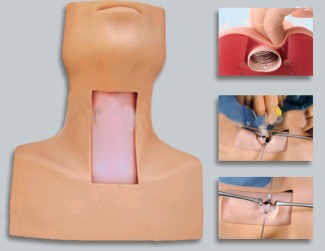功能特點(diǎn): ■ 標(biāo)準(zhǔn)的氣管解剖位置,用手可觸摸氣管,進(jìn)行切口定位。 ■ 模擬病人仰臥位,頸部伸展。 ■ 可以進(jìn)行傳統(tǒng)的經(jīng)皮氣管切開術(shù),包括不同類型的切口:縱向、橫向、十字形、U形和倒U形切口。 ■ 可進(jìn)行環(huán)甲軟骨韌帶穿刺和切開訓(xùn)練。 ■ 模型允許用戶在確定動(dòng)脈位置時(shí)確定正確的切口位置,并可從頭部觀察頸部的內(nèi)部操作情況。 ■ 配備多根模擬氣管和頸部皮膚。